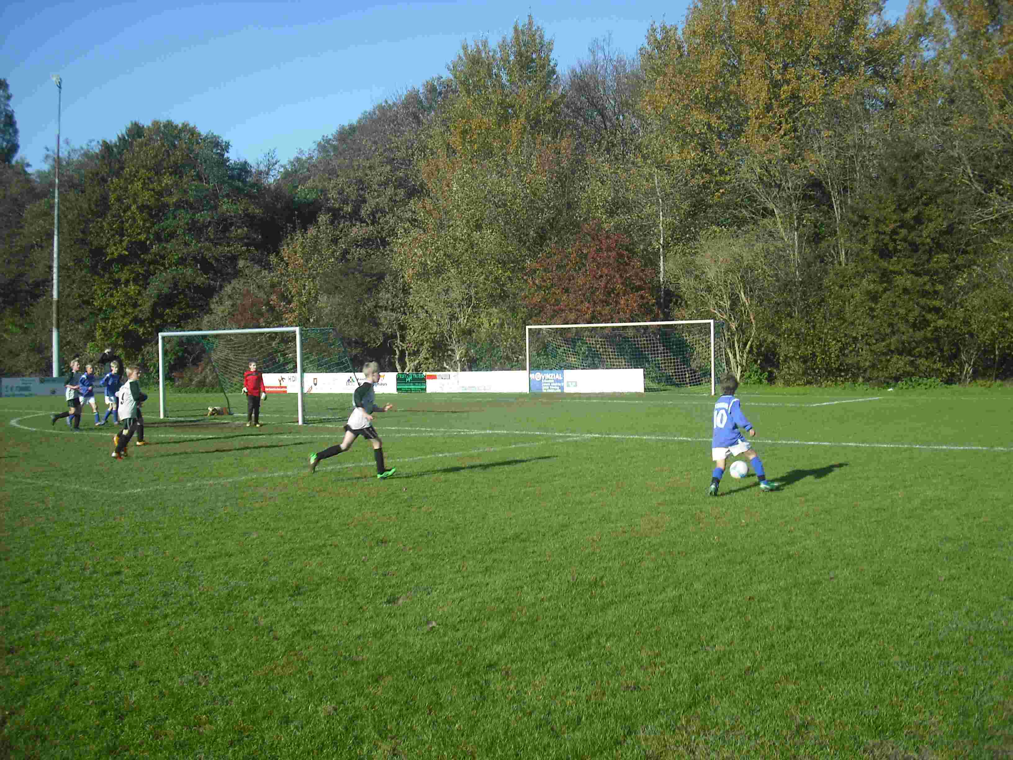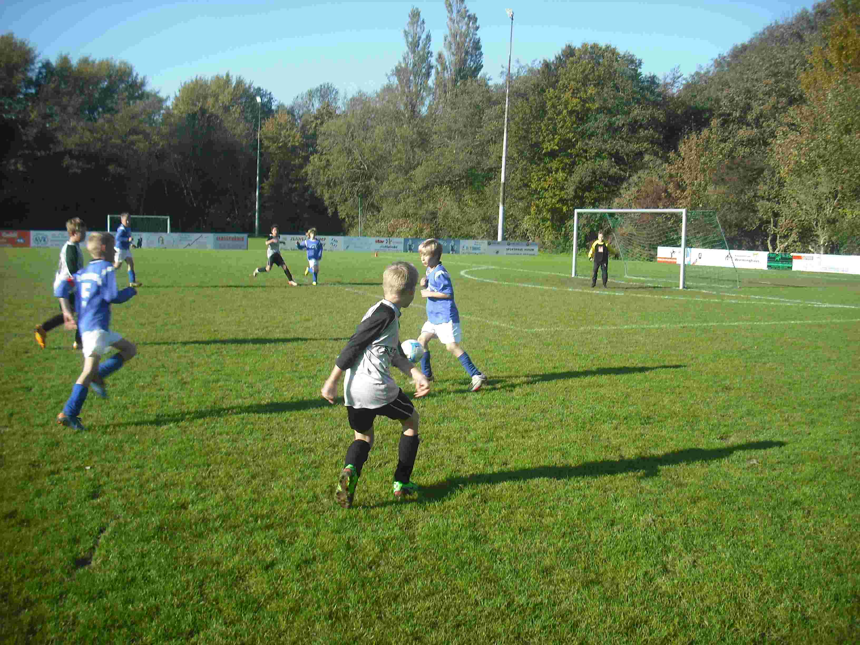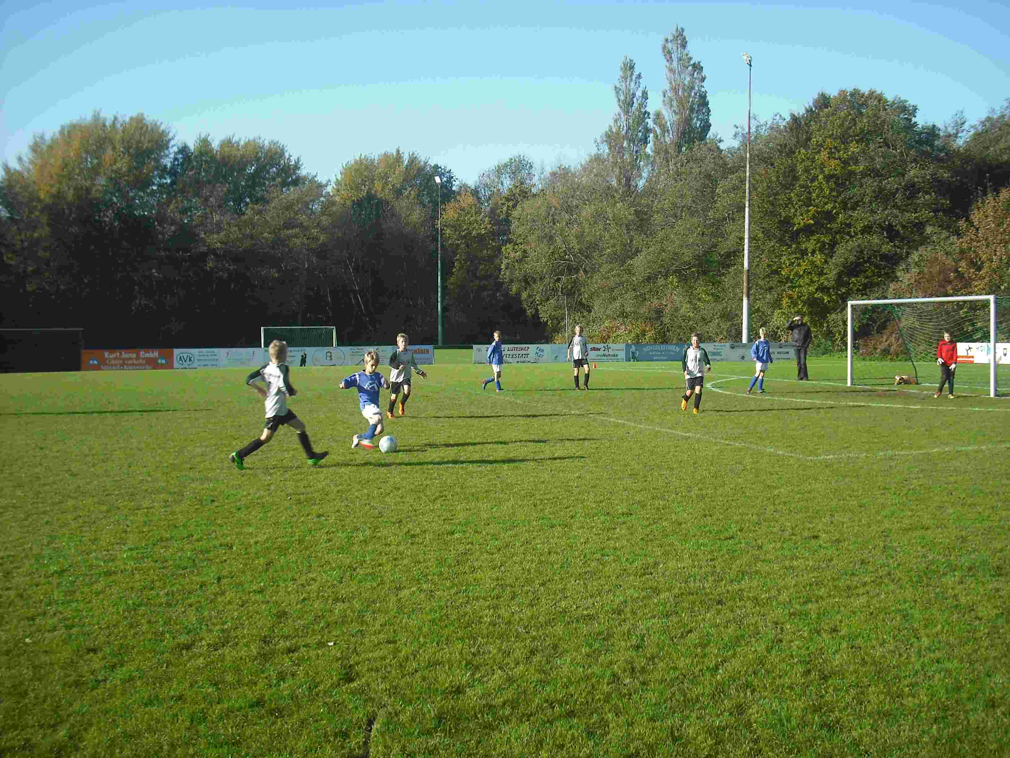4 : 6 Heimniederlage für die E II gegen den TSV Nordstrand am 03.11.2010 Im letzten Heimspiel musste unsere E II auf schwerem Boden gegen den TSV Nordstrand antreten. Unser Gegner nimmt „außer Konkurrenz“ am Staffelbetrieb teil, weil dort in der E-Jugend auch D-Jugend-Spieler spielen, dazu zählt auch der an diesem Tag überragende Torhüter der Nordstrander. In der ersten Halbzeit erzielten wir drei schöne Tore, vermochten aber in der Abwehr den Doppelausfall von Gian-Luca (Klassenfahrt) und Maurice (verletzt) auf der linken Seite nicht zu kompensieren, so dass es zur Halbzeit 3 : 3 stand. Alle Spieler kämpften und bemühten sich, scheiterten aber immer wieder am grandiosen Torhüter des Gegners und vergaben –gelegentlich etwas eigensinnig- serienweise auch beste Torchancen. Und das wird im Fußball leider bestraft: Unser Gegner konterte uns aus und kam zu einem verdienten 6 : 4 Sieg. Gleichwohl war es ein spannendes Spiel und es hat Spaß gemacht! Glückwunsch an den TSV Norstrand Tönning, 03.11.2010 - Andree Peters