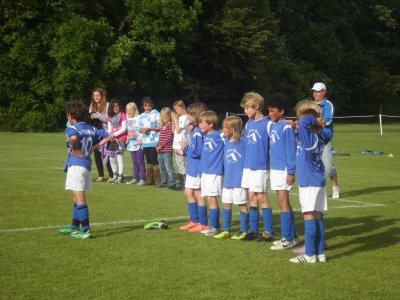 E-Jugend: Wanderpokal des Böklunder Cups 2011 bleibt bei IF Tönning!! Zum Beginn der Saison 2010/2011 kamen Trainer und Spieler aus der E-Jugend des TSV St. Peter-Ording zur E-Jugend von IF Tönning und brachten als Titelverteidiger den Wanderpokal des Böklunder Cups 2010 mit. Mit dem Veranstalter wurde besprochen, dass die E-Jugend von IF Tönning im Jahr 2011 versuchen darf, den Titel zu verteidigen. Am Freitag, 01.07.2011, machten sich Kim Diekmann und Andree Peters nebst zahlreicher Eltern sowie 12 Spielern bepackt mit Zelten und Schlafsäcken auf den Weg nach Böklund, um dort bis Sonntag, 03.07.2011 zu bleiben. Das letzte sportliche Event der Saison 2010/2011 wurde zum Höhepunkt der Saison. Der Veranstalter bot ein perfekt organisiertes Turnier an, bei welchem wirklich alles passte und es hat allen sehr viel Spaß gemacht. Selbst der Umstand, dass wir am Samstag alle „nass wie Katzen waren“, vermochte die tolle Stimmung nicht zu beeinträchtigen. Dass wir im sportlichen Bereich uns in einen Spielrauch würden steigern können, hätte keiner erwartet, trat aber ein und führte dazu, dass wir den Wanderpokal mit nach Tönning nehmen konnten. Im Einzelnen: Bei der E-Jugend spielten 7 Teams „jeder gegen jeden“ mit einer Hin- und Rückrunde über 20 Minuten (später 15 Minuten wegen des Regens....). Am Samstag gewannen wir bei Dauerregen gegen TSV Schönwalde II (3 : 1 und 6 : 1), SG Dannau-Kraköhl (5 : 0), Bramstedter TS (4 : 0), TSV Böklund (2 : 0), spielten gegen TSV Schönwalde I unentschieden (1 : 1) und verloren im letzten Spiel des Tages –die Akkus waren leer- gegen ein sehr starkes Team von Gutheil Wrist verdient mit 5 : 0. Am Sonntag standen wir zu Beginn des zweiten Spieltages auf dem 3. Platz und unser Team wirkte müde und übermüdet. Aber dann machte Kim Diekmann ein tolles und lustiges Aufwärmprogramm und plötzlich wirkten alle wach und konzentriert und steigerten sich von Spiel zu Spiel mit einer geschlossenen Mannschaftsleistung fast in einen Spielrausch. Gegen SG Dannau-Kraköhl siegten wir 7 : 0. Gegen den Bramstedter TS spielten wir 1 : 1. Es folgten Siege gegen TSV Böklund (7 : 1) und TSV Schönwalde I (3 : 0), so dass im letzten Spiel ein Sieg gegen Gutheil Wrist (Hinspiel 5 : 0 verloren!!) her musste. Dank einer tollen kämpferischen und auch spielerisch sehr guten Leistung konnten wir dieses Spiel mit 3 : 2 gewinnen. Wegen der geschlossenen Mannschaftsleistung wollen wir eigentlich einzelne Spieler nicht würdigen, aber die phänomenale Leistung von Ragnar (nicht nur) im letzen Spiel, der Ruhe und Sicherheit ausstrahlte, sicherte uns den Sieg gegen Wrist. (zum vergrößern auf das Bild klicken!) Turniersieger! Pokal gewonnen! Wanderpokal verteidigt! 12 T-Shirts bekommen! Gutschein für freien Eintritt in die Tolk-Show gewonnen! Zu den Zahlen: 29 : 5 Punkte; 42 : 11 Tore. Haupttorschützen: Mats Peters (18); Julian Mertschat (14). Am Ende des Turniers waren sich alle Spieler, Trainer und Eltern einig: Hier müssen wir im nächsten Jahr unbedingt wieder hin.... Andree Peters - 04.07.2011