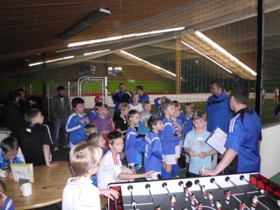 4. Platz beim Hallenturnier der FSG Stapelholm Es gibt Tage da sollte man lieber im Bett bleiben! Dieser Spruch traf heute genau auf unserer E 2 Kicker zu. Geschwächt durch 3 Absagen machten wir uns auf den Weg in die Spothalle nach Schwabstedt zum Turnier der FSG Stapelholm. Gleich im ersten Spiel unseres Teams merkte man, heute passt nichts zusammen. Der Ball lief nicht, Pässe kamen nicht an, Sturm und Abwehr wirkten nervös zudem wurden die Zweikämpfe selten angenommen. Auch unser Torhüter rief sein können heute nur in den seltensten Fällen ab. Mit viel Mühe und sehr viel Glück konnten wir aber doch als Sieger dieses ersten Spieles vom Platz gehen. Leider zog sich diese Situation im gesamten Turnierverlauf durch unser Team. Dazu kam auch noch, wenn wir uns Chancen heraus spielten diese von den Gegnern vereitelt wurden oder das Glück einfach nicht auf unserer Seite war. Am Ende standen nur 1 Sieg, 2 Unentschieden und 2 Niederlagen sowie nur 2 erzielte Tore (David und Lucas) auf unserer Endabrechnung. Aber so ist Fußball!!! Das man nicht immer oben mitspielen kann ist klar, es muss auch mal solche Tage geben. Ich bin mir sicher dass die "Burschen" den heutigen Tag gut wegstecken werden, denn wir sind ein tolles Team!!! Weiter geht es schon am nächsten Samstag beim Hallenturnier der JSG Mitte NF. 11.02.2012 - Hansi (Trainer) (zum vergrößern auf die Bilder klicken!)