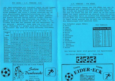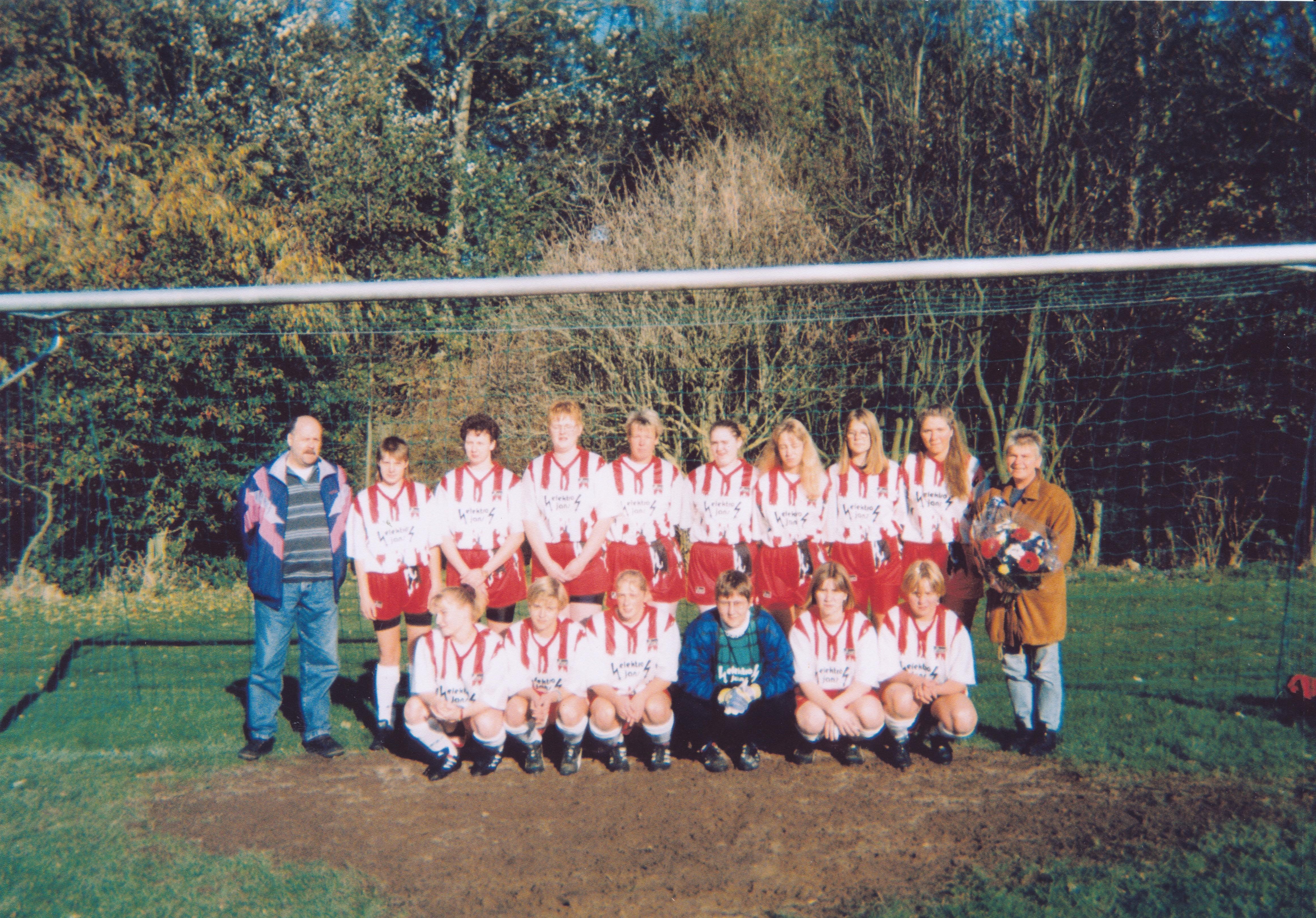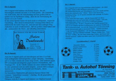 (zum vergrößern auf das Bild klicken) Unsere Damenmannschaft 1995 Hintere Reihe, von links nach rechts: Trainer Karl Heinz "Kulle" Jacobsen, Nicole Glindemann, Antje Kuhfeld, Anja Runge, Karin Dau, Birte Kuppe, Melanie Jacobsen, Meike Hansen, Marlies Clasen. Vordere Reihe, von links nach rechts: Petra Schwandt, Silke Kerth, Susanne Carstensen, Claudia Häse, Ann-Christin Hokamp, Kristin Reiners (zum vergrößern auf das Bild klicken) Unsere F-Jugend in der Saison 1994/1995 mit den Trikotsponsoren Ehepaar Hohnsbehn Hintere Reihe, von links nach rechts: Melf Johannsen, Malte Jensen, Unbekannt, Fabian Wobig, Maik Hedtkamp, Unbekannt, Dominik Clasen, Axel Zumach Vordere Reihe, von links nach rechts: Finn Ole Jochimsen, Tim Meyer, Dennis Pohlmann, Andre Schuster, Michel Reiners, Unbekannt (zum vergrößern auf das Bild klicken) Unsere E I-Jugend in der Saison 1996/1997 Hintere Reihe, von links nach rechts: Walter Schuster, Henning Thiesen, Axel Zumach, Andre Schuster, Florian Cornils, Maik Hedtkamp, Fabian Wobig, Sebastian Saeltz, Reimer Jensen Vordere Reihe, von links nach rechts: L. Nehren, Hannes Jedeck, Sezai Mavi, Dennis Pohlmann, Malte Jacobs, Michel Reiners, Malte Jensen (zum vergrößern auf das Bild klicken) Unsere E II-Jugend in der Saison 1996/1997 Hintere Reihe, von links nach rechts: Marcel Wiese, T. Cords, Dominik Clasen, Thomas Krahnen, J. Johansen, Jan Meyer Vordere Reihe, von links nach rechts: Manuel Dau, Finn Ole Jochimsen, I. Johannsen, L. Nehren, Roman Polifka (zum vergrößern auf das Bild klicken) Unsere A-Jugend in der Saison 1997/1998 Hintere Reihe, von links nach rechts: Namen folgen. Vordere Reihe, von links nach rechts: (zum vergrößern auf das Bild klicken) Unsere Pokalsiegermannschaft von 1976 anlässlich eines Mannschaftstreffen 1996 Hintere Reihe, von links nach rechts:Karl Heinz Jacobsen, Erwin Kröger, Horst Brandt, Gerhard Hecht, Gerhard Mölck, Rainer Ploog, Peter Johannes Otto, Erhard Holst Vordere Reihe, von links nach rechts: Palle Konrad, Martin Larsen, Frenz Wobig, Reimer Jensen, Jürgen Maaß, Rolf Eggers, August Röhe, Gerhard Ratzmann (zum vergrößern auf das Bild klicken) Freundschaftsspiel der "Oldies" von IF Tönning und dem Tönninger SV 1996 anlässlich des Mannschaftstreffen (zum vergrößern auf das Bild klicken) Unsere A-Jugend in der Saison 1999/2000 Hintere Reihe, von links nach rechts:S. Knobbe, T. Laubenstein, T. Wolf, B. Hansen, M. Binz, A. Quast, G. Hach, O. Stolz Vordere Reihe, von links nach rechts: G. Fekay, T. Bertold, K. Diekmann, V. Yesil, D. Gärtner, R. Pohlmann, C. Kolodziey, R. Jensen