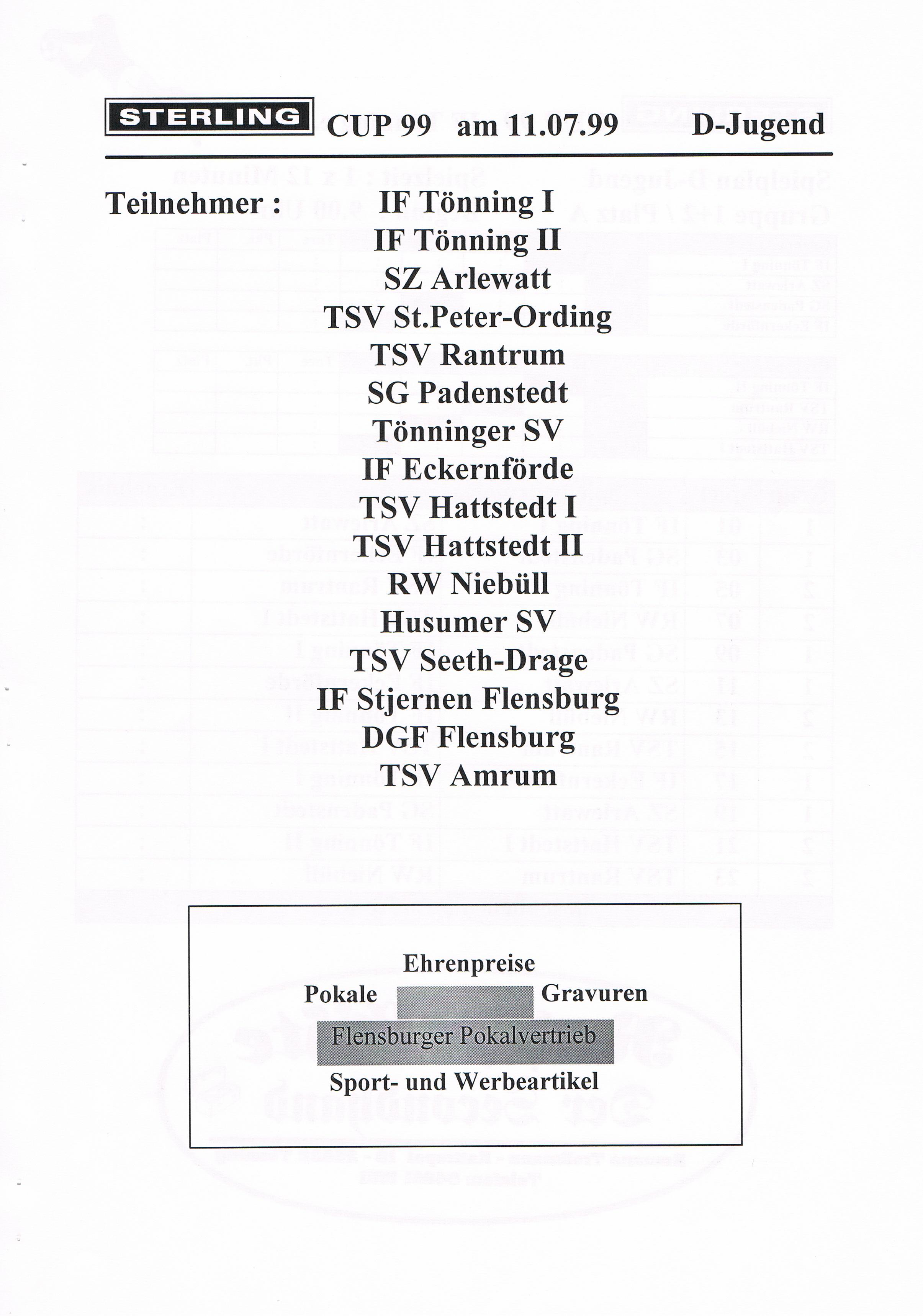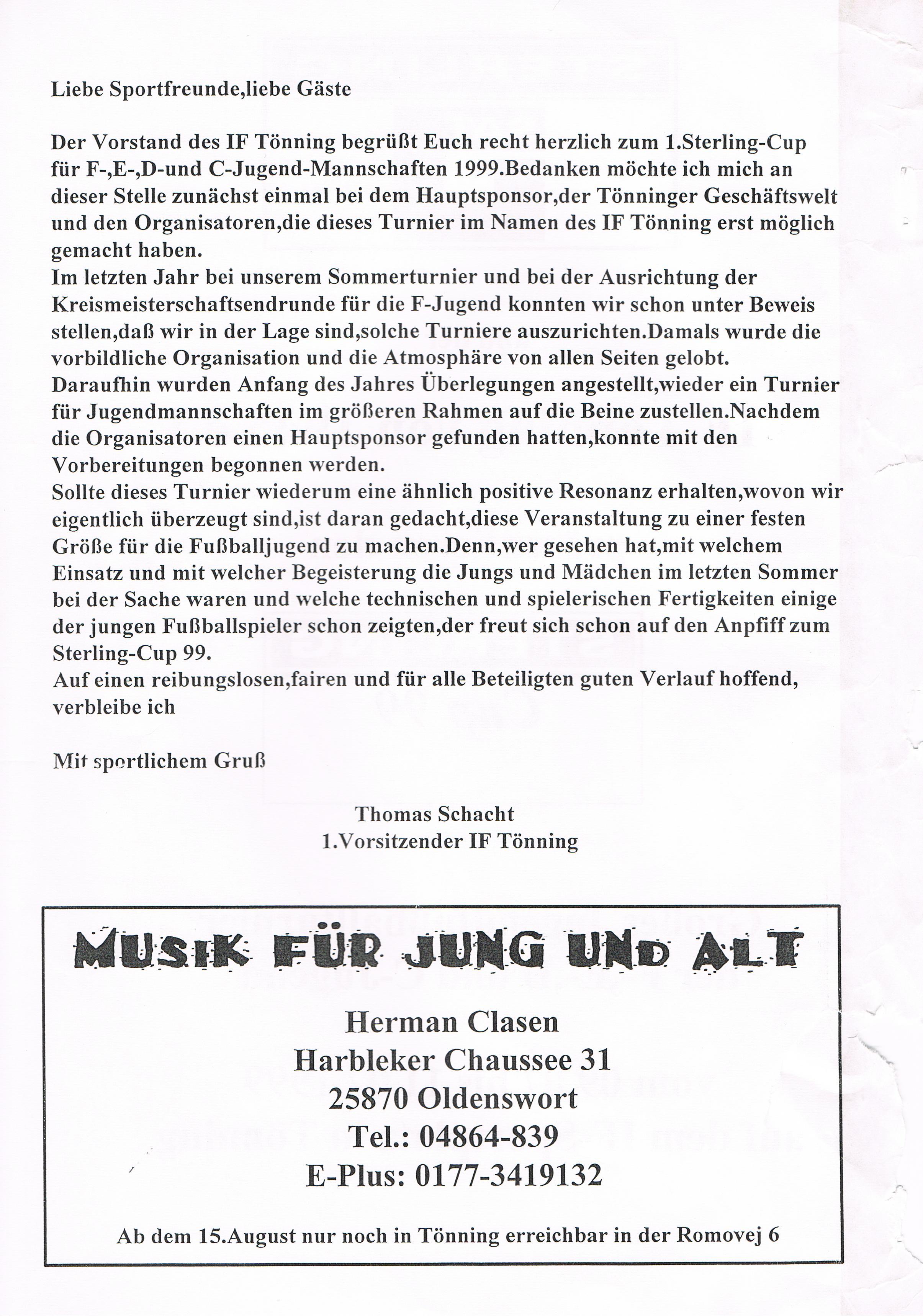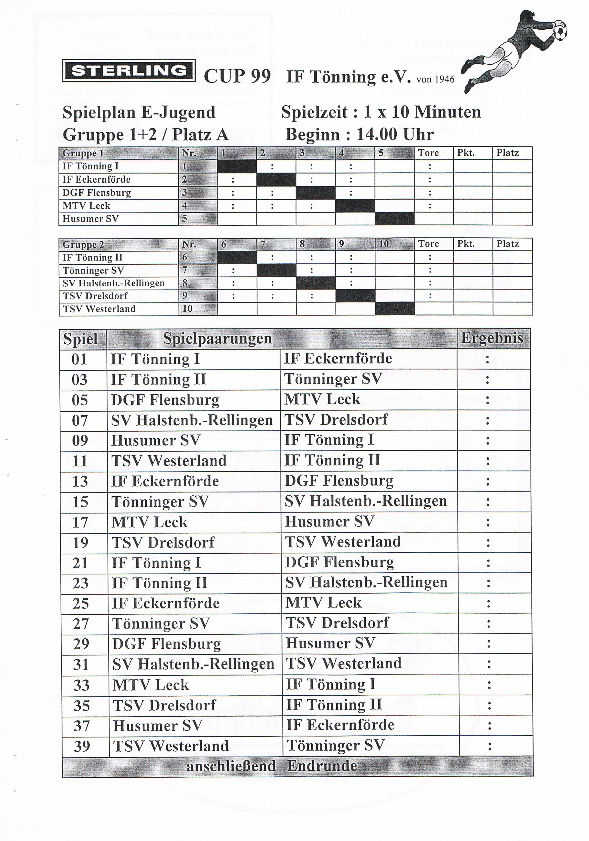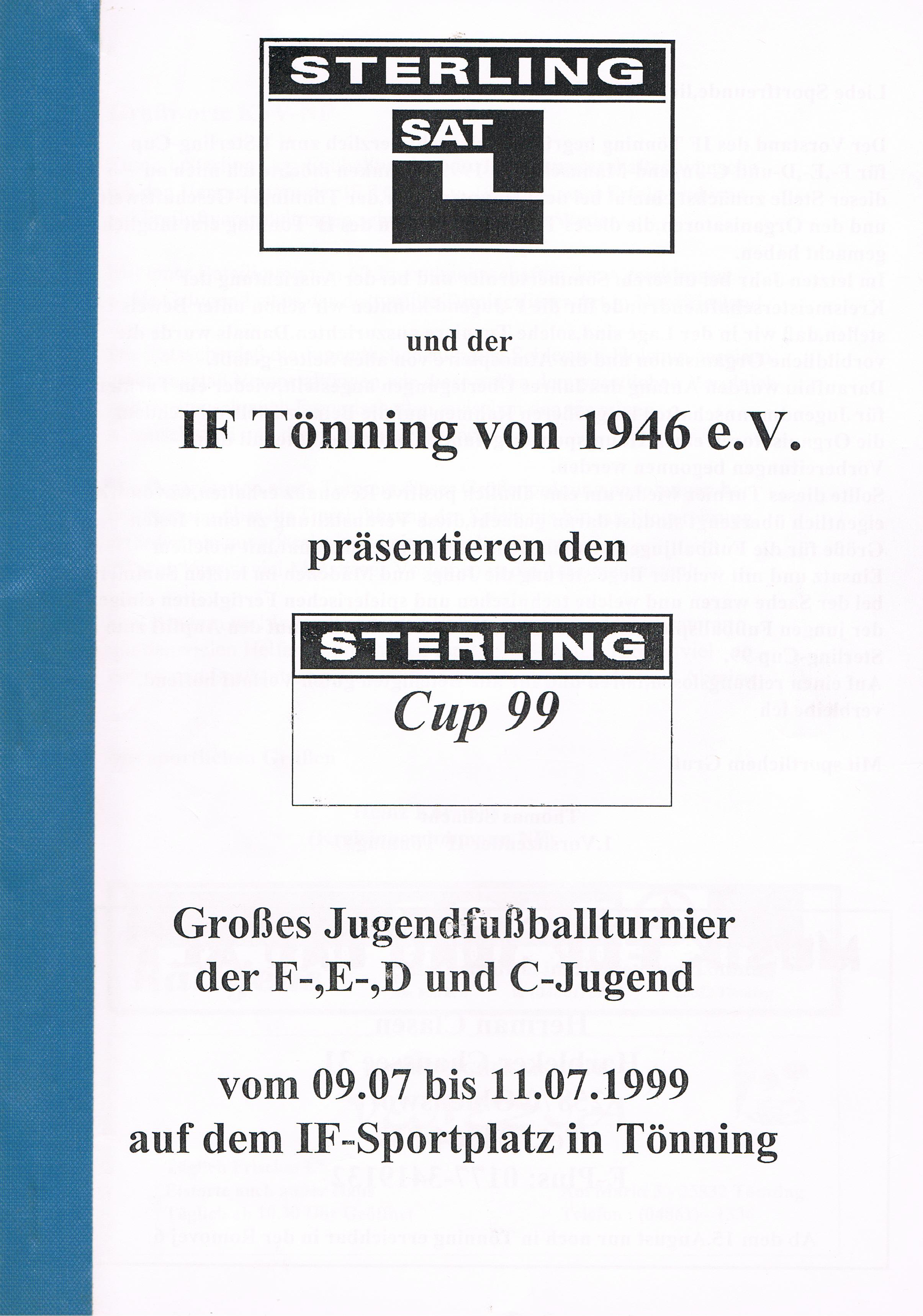 Jugendfußballturnier Sterling Cup beim IF Tönning Das große Jugendfußballturnier beim IF Tönning, der Sterling-Cup ist aus dem Terminkalender nicht nur beim IF Tönning, sondern auch bei vielen anderen Vereinen nicht mehr weg zudenken. Nachdem man im Jahre 1998 auf Wunsch der Betreuer und Trainer aus dem Jugendbereich erstmals seit vielen Jahren wieder ein Feldturnier im Sommer veranstaltet hatte und dies gut angenommen wurde, gab es Überlegungen so ein Turnier im nächsten Jahr zu wiederholen. Um so ein Turnier auf die Beine zu stellen und zu organisieren, braucht es viele, sehr viele helfende Hände und natürlich auch Sponsoren. Es wurde ein Hauptsponsor gesucht, dessen Name auch den Namen dieses Turniers tragen sollte. Beim damals größten Arbeitgeber in Tönning, der Firma Sterling SIHI Anlagentechnik, wurden 2 Vereinsmitglieder vorstellig und erläuterten unser Vorhaben. Von der Idee ein Turnier für ca. 500 - 600 Jungs und Mädchen an 3 Tagen zu veranstalten war man bei der Firma Sterling SIHI angetan und so erklärte sich die Firma bereit uns zu unterstützen. Aber auch aus der Tönninger und Eiderstedter Geschäftswelt gab es Unterstützung und so entschloss man sich ein Turnierheft zu entwerfen, in dem alle Sponsoren mit einer Anzeige werben konnten. Dieses Heft, mit einer Auflage von 800 Stück war die erste größere Bewährungsprobe die uns für dieses Vorhaben bevorstand. Es mussten Werbeanzeigen aus der Geschäftswelt eingeholt und 25 Seiten mit Werbung, Spielplänen und Grußworten auf einem PC gestaltet werden. Mit einem Kopierer den die Firma Sterling SIHI uns freundlicherweise zur Verfügung gestellt hatte, wurden 20.000 Tausend Kopien gemacht, das waren 10.000 Tausend Blatt Papier! Dank sehr vieler fleißiger Hände hatten wir die 800 Exemplare in einigen Stunden zusammen getackert und gebunden. Mit vielen Freiwilligen Helfern wurden die Plätze hergerichtet, Zelte zum Umkleiden für die Mannschaften aufgebaut, Tombola- und Spielstände für die Besucher aufgebaut. Die Eltern unserer jungen Spieler erklärten sich bereit Kuchen und Torten für ein Kuchenbuffet zu spenden. Aktive und Passive Mitglieder stellten ihre Dienst als Schiedsrichter zur Verfügung und und und. Viele Mitglieder des IF Tönning haben mit dieser Aktion bewiesen, wenn alle mit Anpacken, können wir beim IF Tönning etwas Großes erreichen und so eine Veranstaltung planen, organisieren und perfekt umsetzen. Im Jahr 1999 nahmen 58 und im Jahr 2000 57 Mannschaften von der F-, E-, D- bis zur C-Jugend teil. Bis heute (2010) haben 645 Mannschaften aus Schleswig-Holstein, Hamburg, Niedersachsen und Dänemark am Sterling-Cup beim IF Tönning teilgenommen. Die Sieger beim Sterling-Cup 1999: Werden nachgetragen! Die Sieger beim Sterling-Cup 2000: F-Jugend: Bredstedter TSV, E-Jugend: IF Tönning, D-Jugend: VfB Nordmark Flensburg, C-Jugend: BSC Brunsbüttel