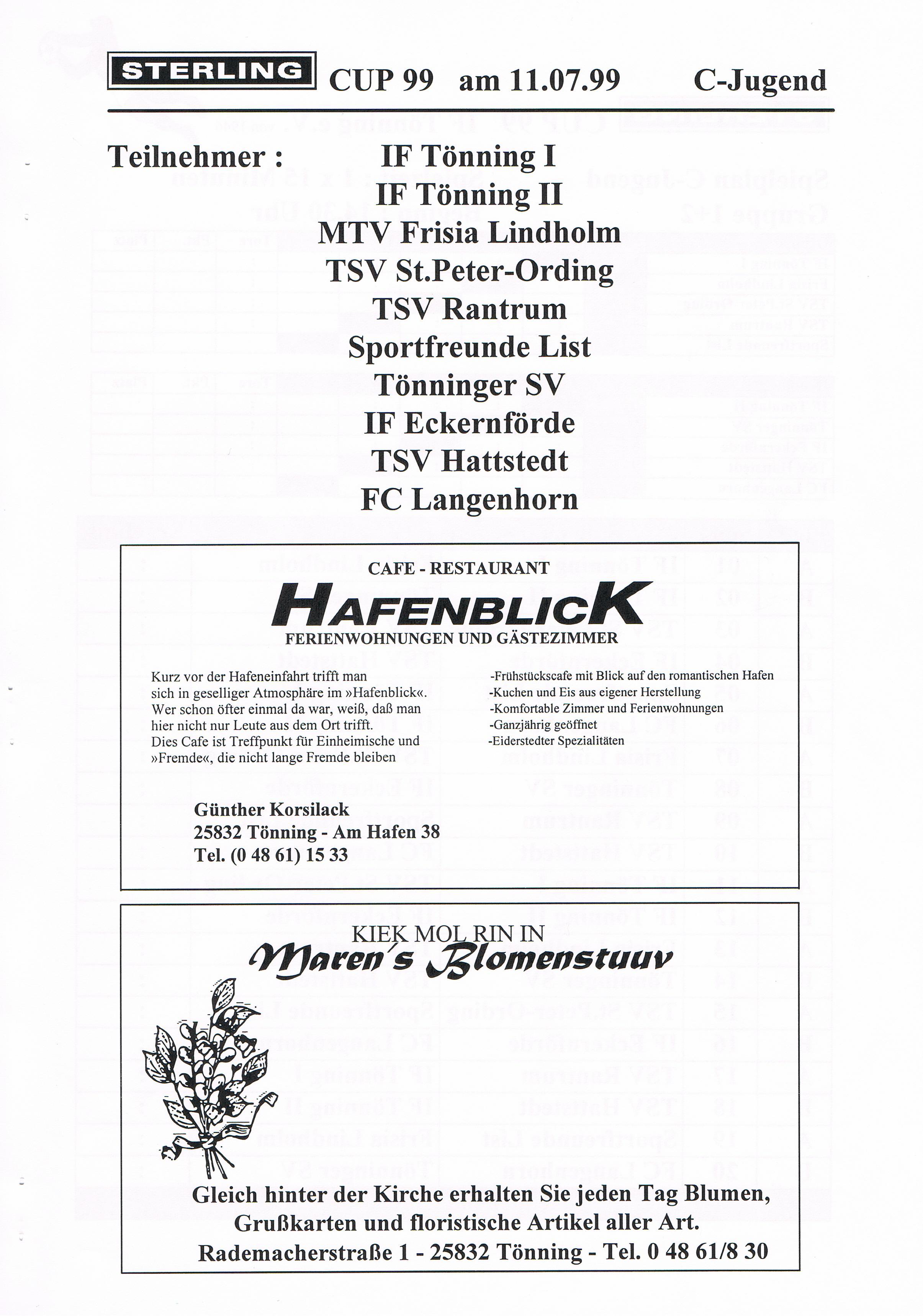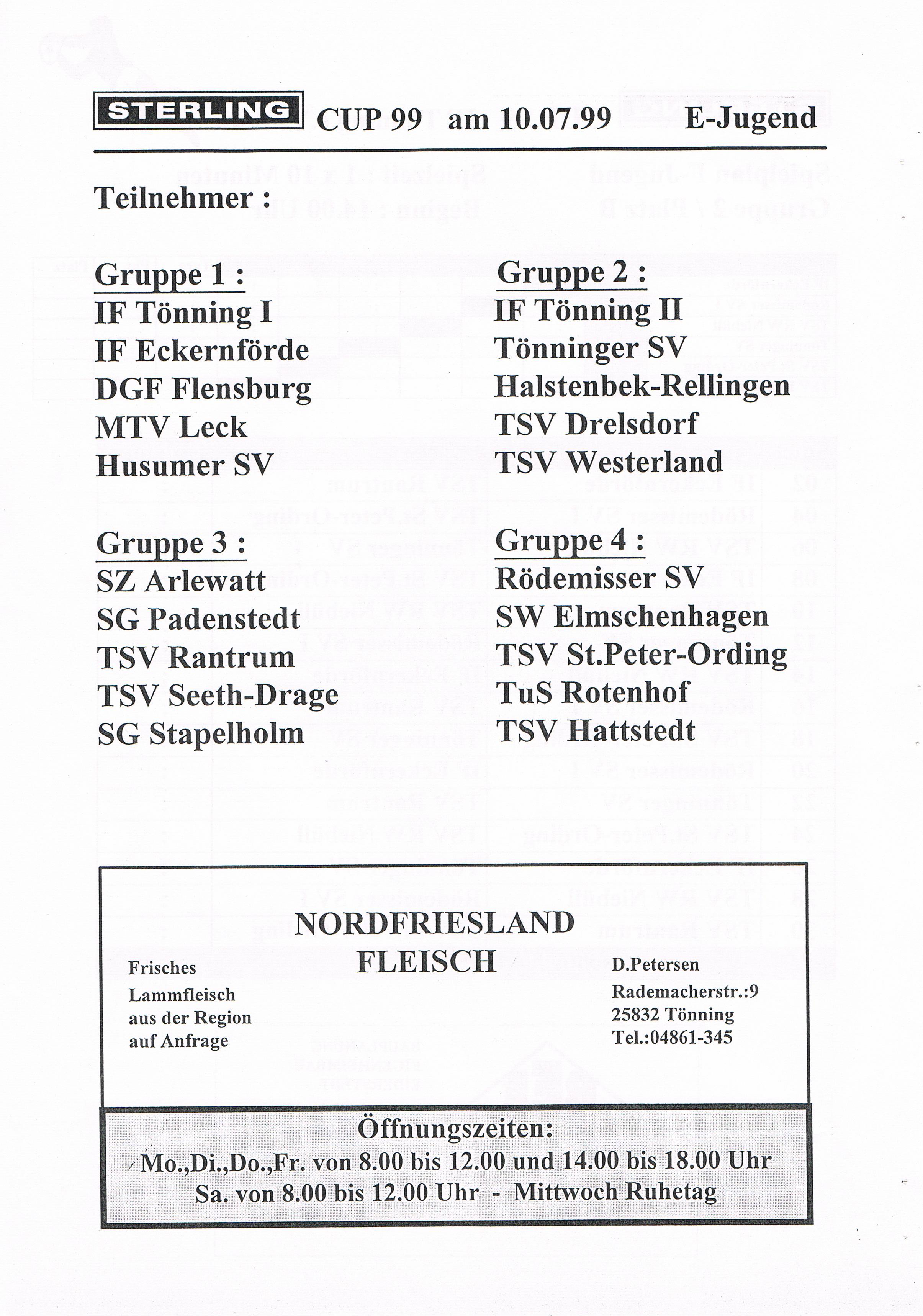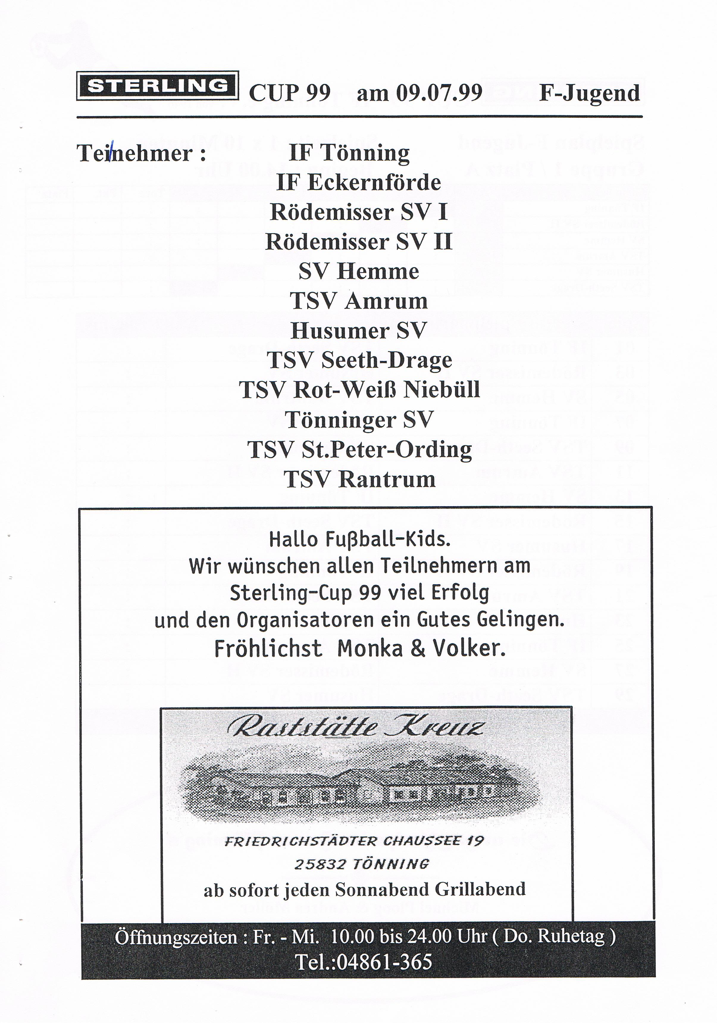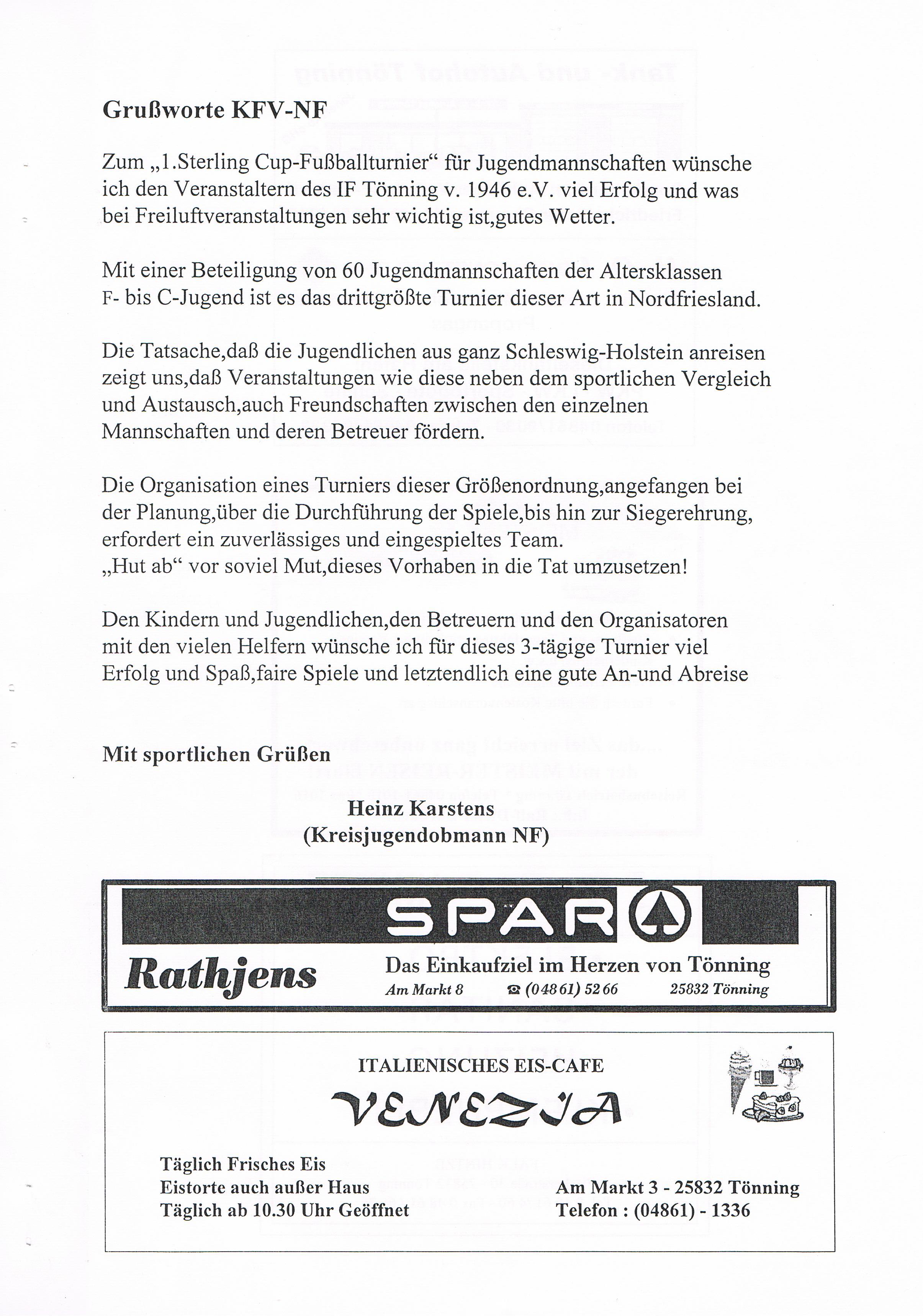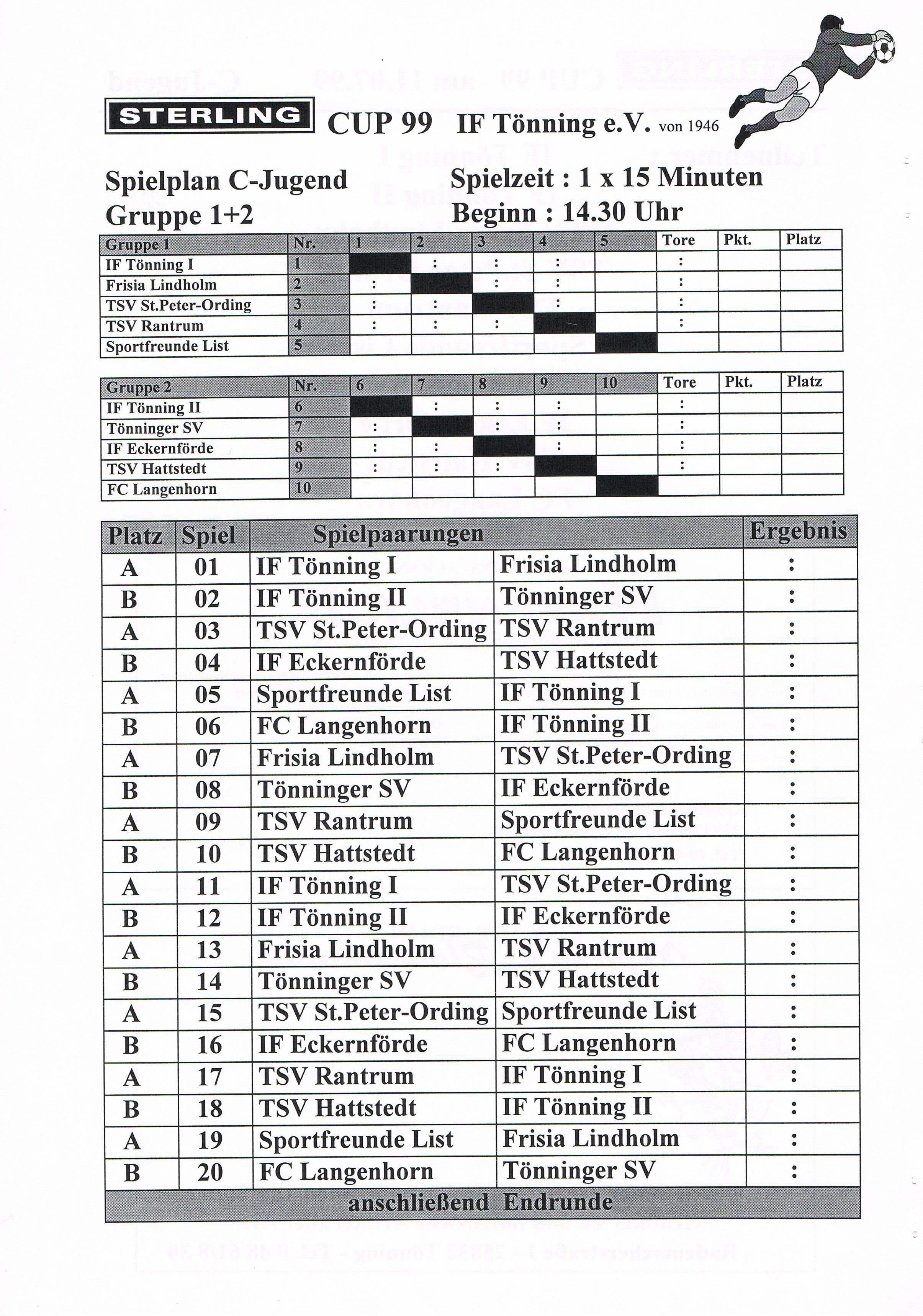 Jugendfußballturnier Sterling Cup beim IF Tönning Das große Jugendfußballturnier beim IF Tönning, der Sterling-Cup ist aus dem Terminkalender nicht nur beim IF Tönning, sondern auch bei vielen anderen Vereinen nicht mehr weg zudenken. Nachdem man im Jahre 1998 auf Wunsch der Betreuer und Trainer aus dem Jugendbereich erstmals seit vielen Jahren wieder ein Feldturnier im Sommer veranstaltet hatte und dies gut angenommen wurde, gab es Überlegungen so ein Turnier im nächsten Jahr zu wiederholen. Um so ein Turnier auf die Beine zu stellen und zu organisieren, braucht es viele, sehr viele helfende Hände und natürlich auch Sponsoren. Es wurde ein Hauptsponsor gesucht, dessen Name auch den Namen dieses Turniers tragen sollte. Beim damals größten Arbeitgeber in Tönning, der Firma Sterling SIHI Anlagentechnik, wurden 2 Vereinsmitglieder vorstellig und erläuterten unser Vorhaben. Von der Idee ein Turnier für ca. 500 - 600 Jungs und Mädchen an 3 Tagen zu veranstalten war man bei der Firma Sterling SIHI angetan und so erklärte sich die Firma bereit uns zu unterstützen. Aber auch aus der Tönninger und Eiderstedter Geschäftswelt gab es Unterstützung und so entschloss man sich ein Turnierheft zu entwerfen, in dem alle Sponsoren mit einer Anzeige werben konnten. Dieses Heft, mit einer Auflage von 800 Stück war die erste größere Bewährungsprobe die uns für dieses Vorhaben bevorstand. Es mussten Werbeanzeigen aus der Geschäftswelt eingeholt und 25 Seiten mit Werbung, Spielplänen und Grußworten auf einem PC gestaltet werden. Mit einem Kopierer den die Firma Sterling SIHI uns freundlicherweise zur Verfügung gestellt hatte, wurden 20.000 Tausend Kopien gemacht, das waren 10.000 Tausend Blatt Papier! Dank sehr vieler fleißiger Hände hatten wir die 800 Exemplare in einigen Stunden zusammen getackert und gebunden. Mit vielen Freiwilligen Helfern wurden die Plätze hergerichtet, Zelte zum Umkleiden für die Mannschaften aufgebaut, Tombola- und Spielstände für die Besucher aufgebaut. Die Eltern unserer jungen Spieler erklärten sich bereit Kuchen und Torten für ein Kuchenbuffet zu spenden. Aktive und Passive Mitglieder stellten ihre Dienst als Schiedsrichter zur Verfügung und und und. Viele Mitglieder des IF Tönning haben mit dieser Aktion bewiesen, wenn alle mit Anpacken, können wir beim IF Tönning etwas Großes erreichen und so eine Veranstaltung planen, organisieren und perfekt umsetzen. Im Jahr 1999 nahmen 58 und im Jahr 2000 57 Mannschaften von der F-, E-, D- bis zur C-Jugend teil. Bis heute (2010) haben 645 Mannschaften aus Schleswig-Holstein, Hamburg, Niedersachsen und Dänemark am Sterling-Cup beim IF Tönning teilgenommen. Die Sieger beim Sterling-Cup 1999: Werden nachgetragen! Die Sieger beim Sterling-Cup 2000: F-Jugend: Bredstedter TSV, E-Jugend: IF Tönning, D-Jugend: VfB Nordmark Flensburg, C-Jugend: BSC Brunsbüttel