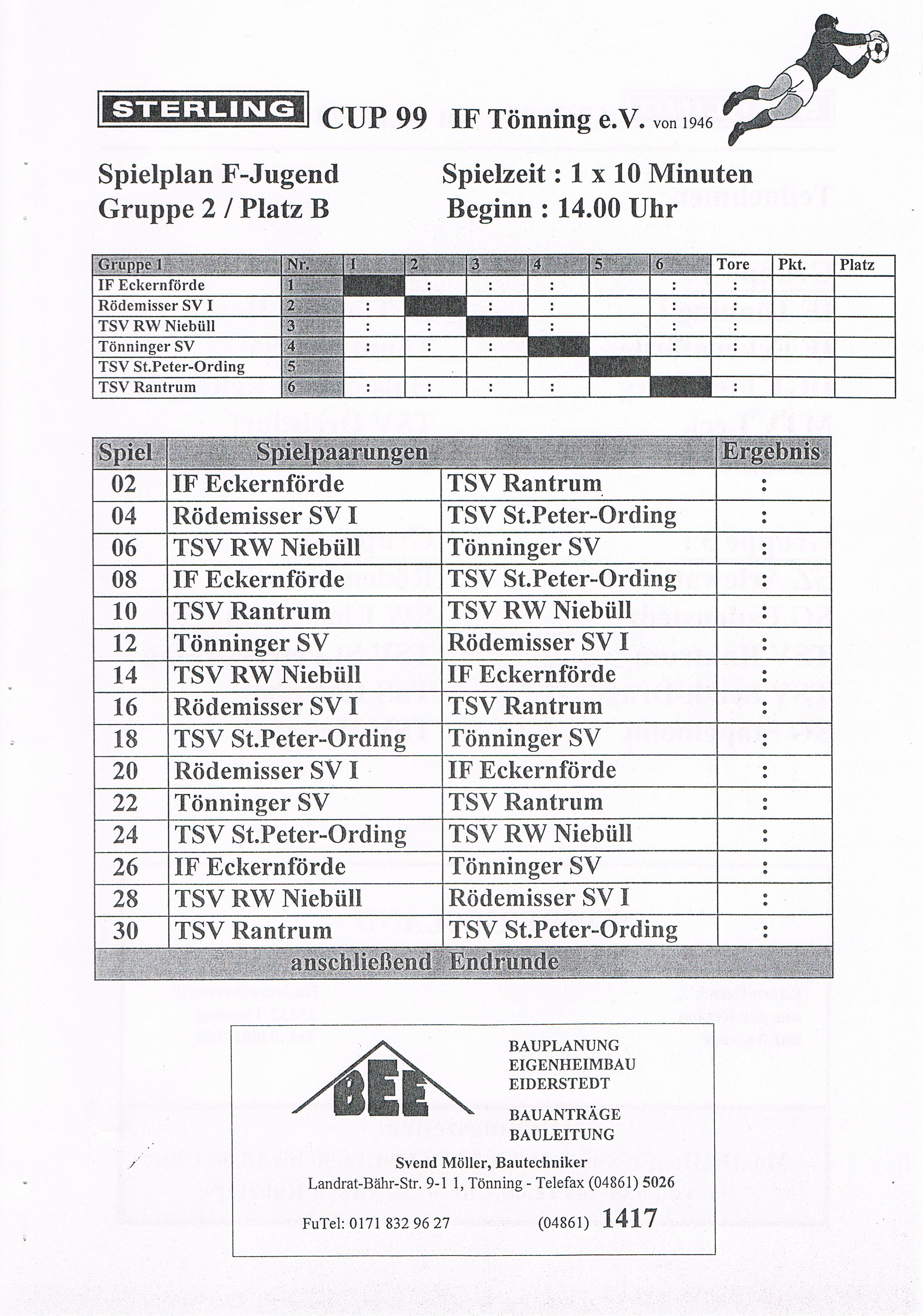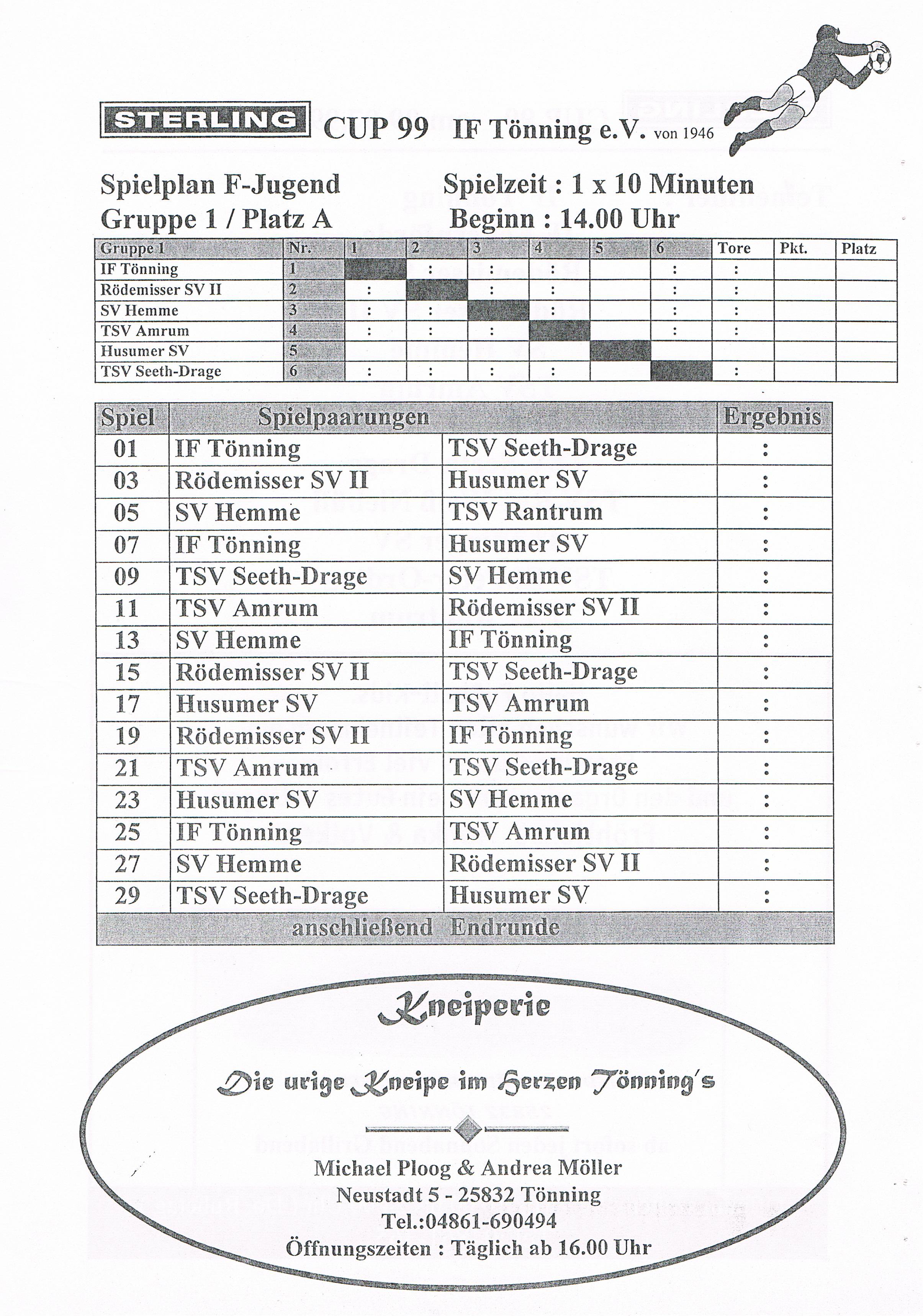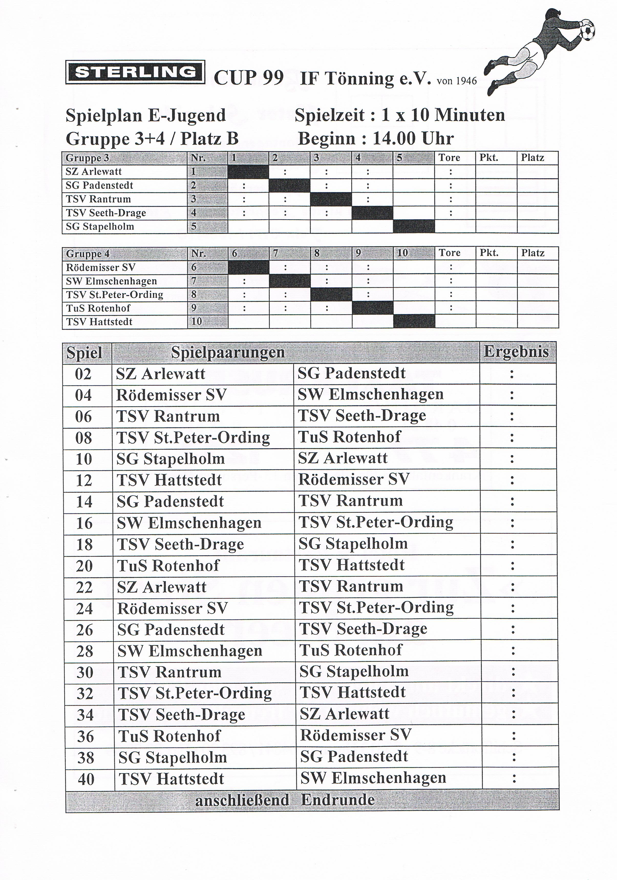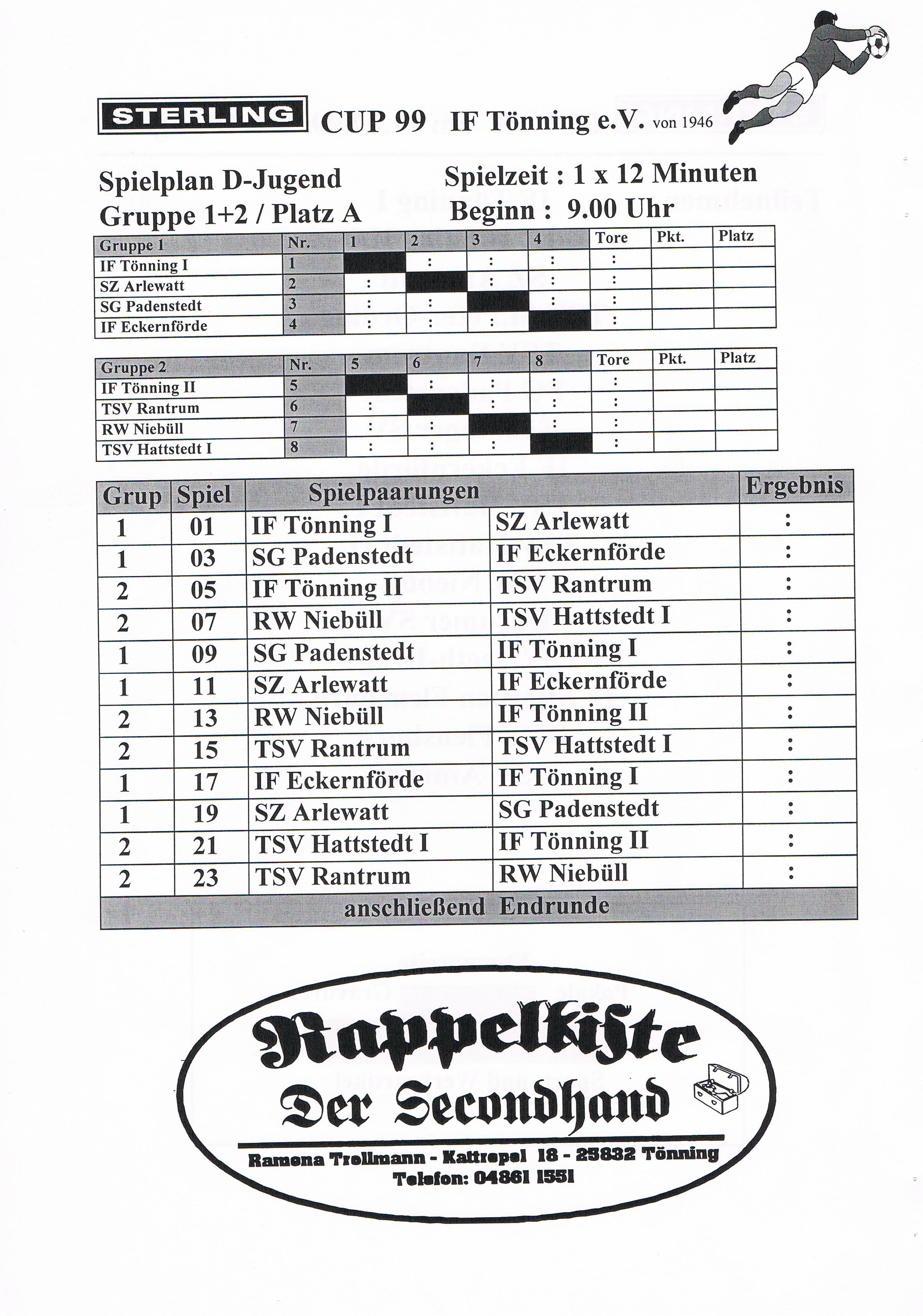 Jugendfußballturnier Sterling Cup beim IF Tönning Das große Jugendfußballturnier beim IF Tönning, der Sterling-Cup ist aus dem Terminkalender nicht nur beim IF Tönning, sondern auch bei vielen anderen Vereinen nicht mehr weg zudenken. Nachdem man im Jahre 1998 auf Wunsch der Betreuer und Trainer aus dem Jugendbereich erstmals seit vielen Jahren wieder ein Feldturnier im Sommer veranstaltet hatte und dies gut angenommen wurde, gab es Überlegungen so ein Turnier im nächsten Jahr zu wiederholen. Um so ein Turnier auf die Beine zu stellen und zu organisieren, braucht es viele, sehr viele helfende Hände und natürlich auch Sponsoren. Es wurde ein Hauptsponsor gesucht, dessen Name auch den Namen dieses Turniers tragen sollte. Beim damals größten Arbeitgeber in Tönning, der Firma Sterling SIHI Anlagentechnik, wurden 2 Vereinsmitglieder vorstellig und erläuterten unser Vorhaben. Von der Idee ein Turnier für ca. 500 - 600 Jungs und Mädchen an 3 Tagen zu veranstalten war man bei der Firma Sterling SIHI angetan und so erklärte sich die Firma bereit uns zu unterstützen. Aber auch aus der Tönninger und Eiderstedter Geschäftswelt gab es Unterstützung und so entschloss man sich ein Turnierheft zu entwerfen, in dem alle Sponsoren mit einer Anzeige werben konnten. Dieses Heft, mit einer Auflage von 800 Stück war die erste größere Bewährungsprobe die uns für dieses Vorhaben bevorstand. Es mussten Werbeanzeigen aus der Geschäftswelt eingeholt und 25 Seiten mit Werbung, Spielplänen und Grußworten auf einem PC gestaltet werden. Mit einem Kopierer den die Firma Sterling SIHI uns freundlicherweise zur Verfügung gestellt hatte, wurden 20.000 Tausend Kopien gemacht, das waren 10.000 Tausend Blatt Papier! Dank sehr vieler fleißiger Hände hatten wir die 800 Exemplare in einigen Stunden zusammen getackert und gebunden. Mit vielen Freiwilligen Helfern wurden die Plätze hergerichtet, Zelte zum Umkleiden für die Mannschaften aufgebaut, Tombola- und Spielstände für die Besucher aufgebaut. Die Eltern unserer jungen Spieler erklärten sich bereit Kuchen und Torten für ein Kuchenbuffet zu spenden. Aktive und Passive Mitglieder stellten ihre Dienst als Schiedsrichter zur Verfügung und und und. Viele Mitglieder des IF Tönning haben mit dieser Aktion bewiesen, wenn alle mit Anpacken, können wir beim IF Tönning etwas Großes erreichen und so eine Veranstaltung planen, organisieren und perfekt umsetzen. Im Jahr 1999 nahmen 58 und im Jahr 2000 57 Mannschaften von der F-, E-, D- bis zur C-Jugend teil. Bis heute (2010) haben 645 Mannschaften aus Schleswig-Holstein, Hamburg, Niedersachsen und Dänemark am Sterling-Cup beim IF Tönning teilgenommen. Die Sieger beim Sterling-Cup 1999: Werden nachgetragen! Die Sieger beim Sterling-Cup 2000: F-Jugend: Bredstedter TSV, E-Jugend: IF Tönning, D-Jugend: VfB Nordmark Flensburg, C-Jugend: BSC Brunsbüttel