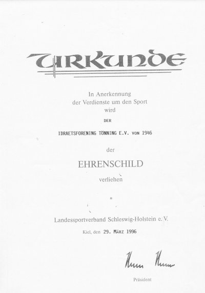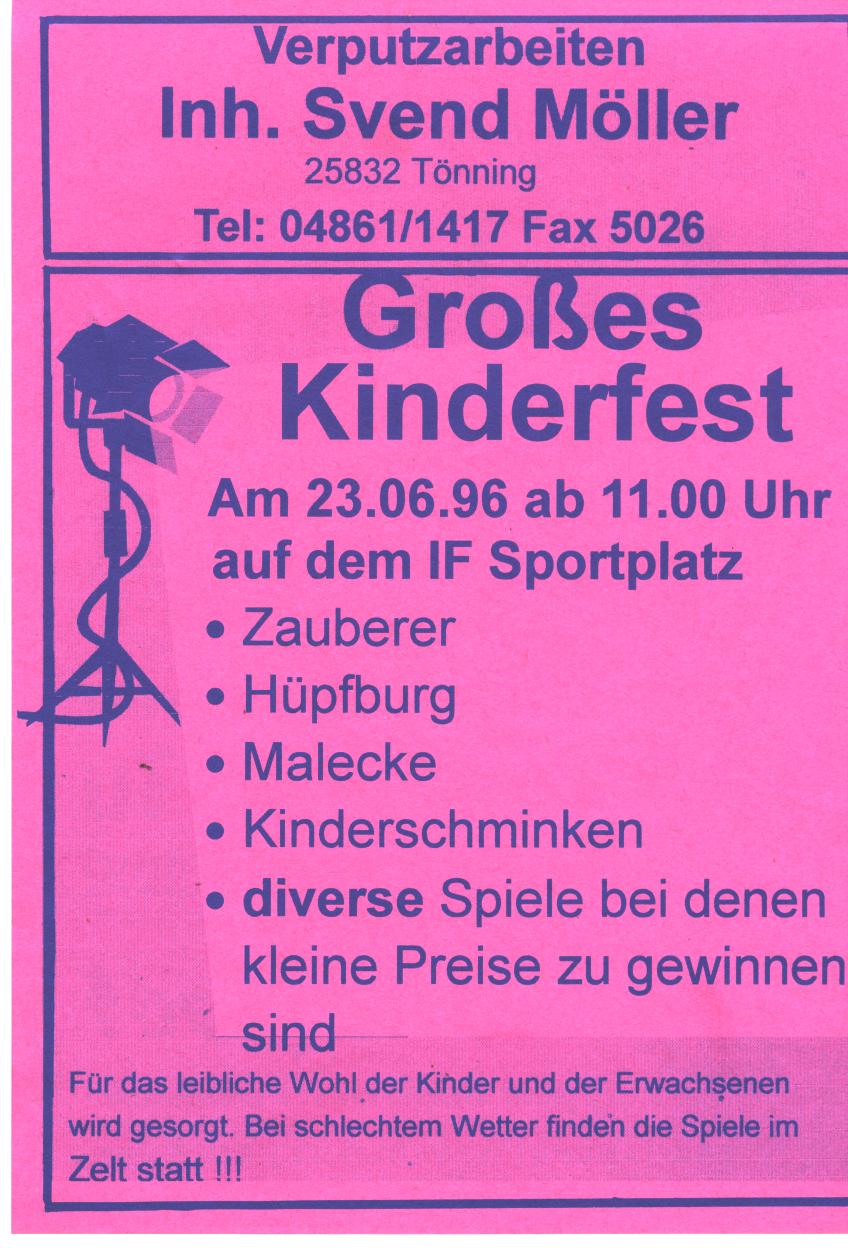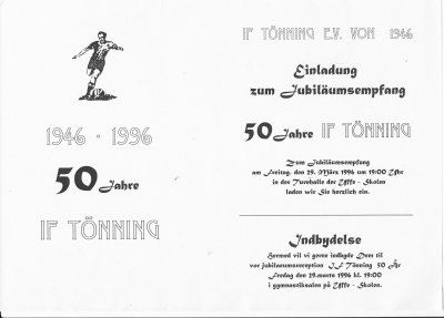 Am 29. März 1996 wurde mit einem Empfang in der Turnhalle der Uffe-Skolen offiziell unser 50-jähriges Vereinsjubiläum gefeiert. Im Juni 1996 gab es dann einen Spielenachmittag mit Hüpfburg, Zauberer und weitere Spiele für die Kinder und Jugendlichen, am Abend wurde dann mit einer DISCO im Festzelt auf dem IF Sportplatz bis in den frühen Morgen gefeiert. (zum vergrößern auf das Bild klicken) (zum vergrößern auf das Bild klicken) (zum vergrößern auf das Bild klicken) (zum vergrößern auf das Bild klicken) (zum vergrößern auf das Bild klicken) (zum vergrößern auf das Bild klicken) (zum vergrößern auf das Bild klicken) (zum vergrößern auf das Bild klicken) (zum vergrößern auf das Bild klicken) (zum vergrößern auf das Bild klicken) (zum vergrößern auf das Bild klicken)
