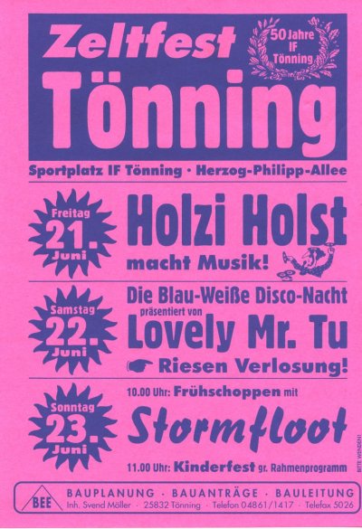 Das folgende Bildmaterial vom Zeltfest zum 50-jährigen Bestehen von IF Tönning wurde uns freundlicherweise von Sabine Möller aus Husum zur Verfügung gestellt. (zum vergrößern auf das Bild klicken) (zum vergrößern auf das Bild klicken) (zum vergrößern auf das Bild klicken) (zum vergrößern auf das Bild klicken) (zum vergrößern auf das Bild klicken) (zum vergrößern auf das Bild klicken) (zum vergrößern auf das Bild klicken) (zum vergrößern auf das Bild klicken) (zum vergrößern auf das Bild klicken) (zum vergrößern auf das Bild klicken) (zum vergrößern auf das Bild klicken) (zum vergrößern auf das Bild klicken) (zum vergrößern auf das Bild klicken) (zum vergrößern auf das Bild klicken) (zum vergrößern auf das Bild klicken) (zum vergrößern auf das Bild klicken) (zum vergrößern auf das Bild klicken) (zum vergrößern auf das Bild klicken) (zum vergrößern auf das Bild klicken) (zum vergrößern auf das Bild klicken) (zum vergrößern auf das Bild klicken) (zum vergrößern auf das Bild klicken)